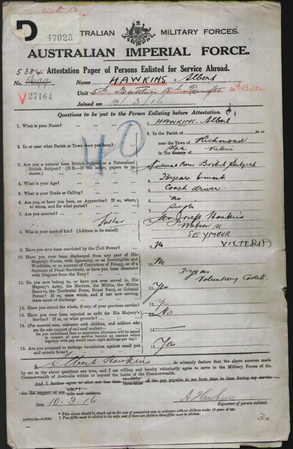 Albert enlisted at Melbourne on March 10th 1916 and was initially enlisted into the 5th Infantry Battalion, 18th Reinforcements. Note that he gives his occupation as Coach Driver
