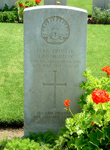 Horton Headstone Published May 14, 2015 at 369 × 500 in John Holland Horton The Headstone of John Holland Horton at the Alexandria (Chatby) Military and War Memorial Cemetery in Egypt Source: The War Graves Photographic Project HERE