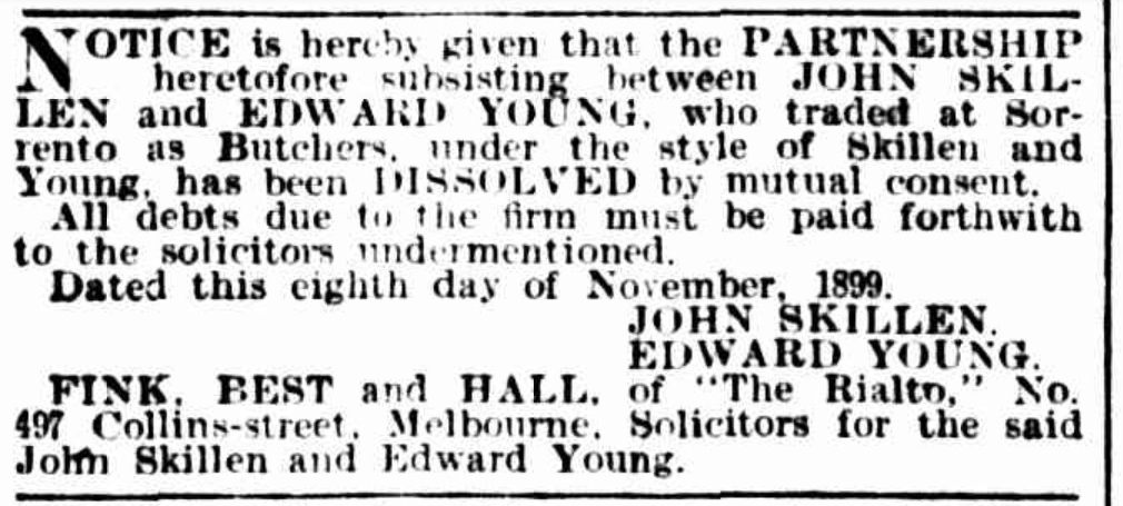 John Alfred “Jack” Skillen (1868 -1924) was born in Daylesford. His father James was a grocer. By the early 1890s he was an employee of Mornington butcher J.S. Adams. Soon afterwards he opened a butchers in Sorrento. 6