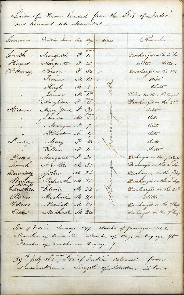 This list of patients from the Star of India is one of many original documents available to be viewed from the Quarantine Station Archive: