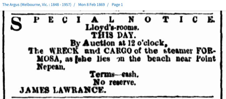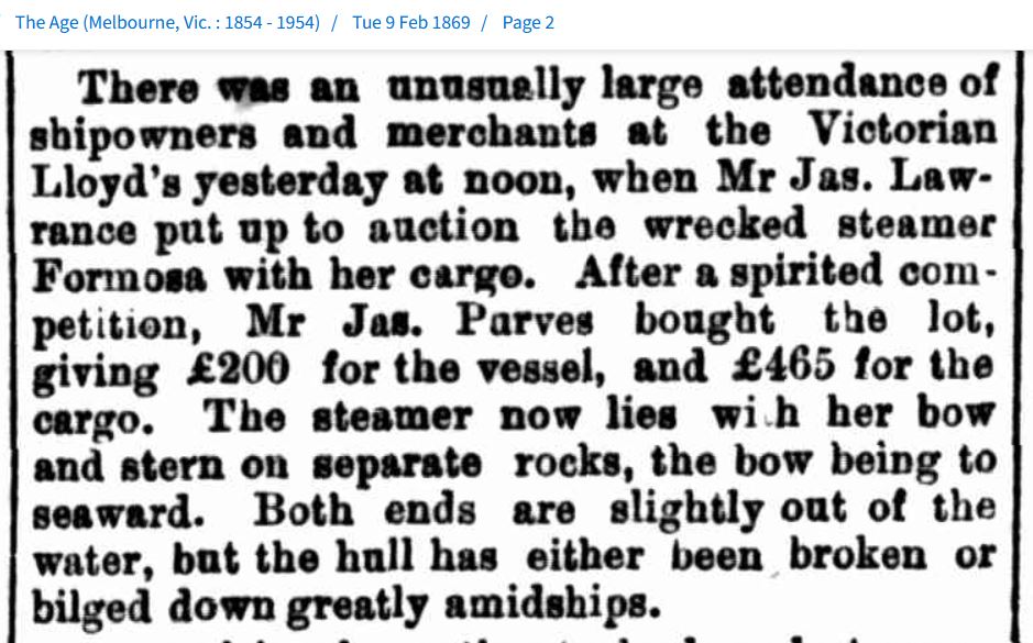 The Formosa was an iron steamer (rigged as a three-masted schooner at this time) that was wrecked at Portsea on her maiden voyage from Glasgow.