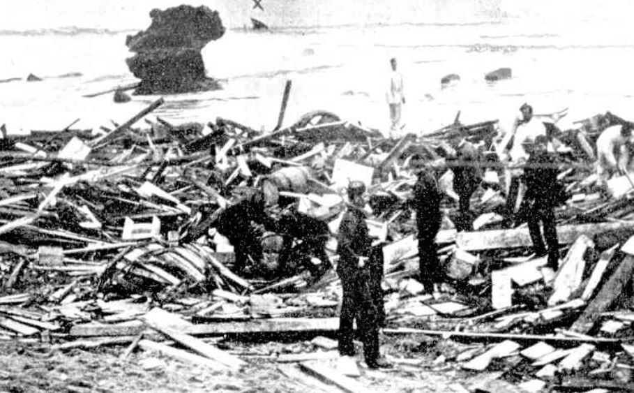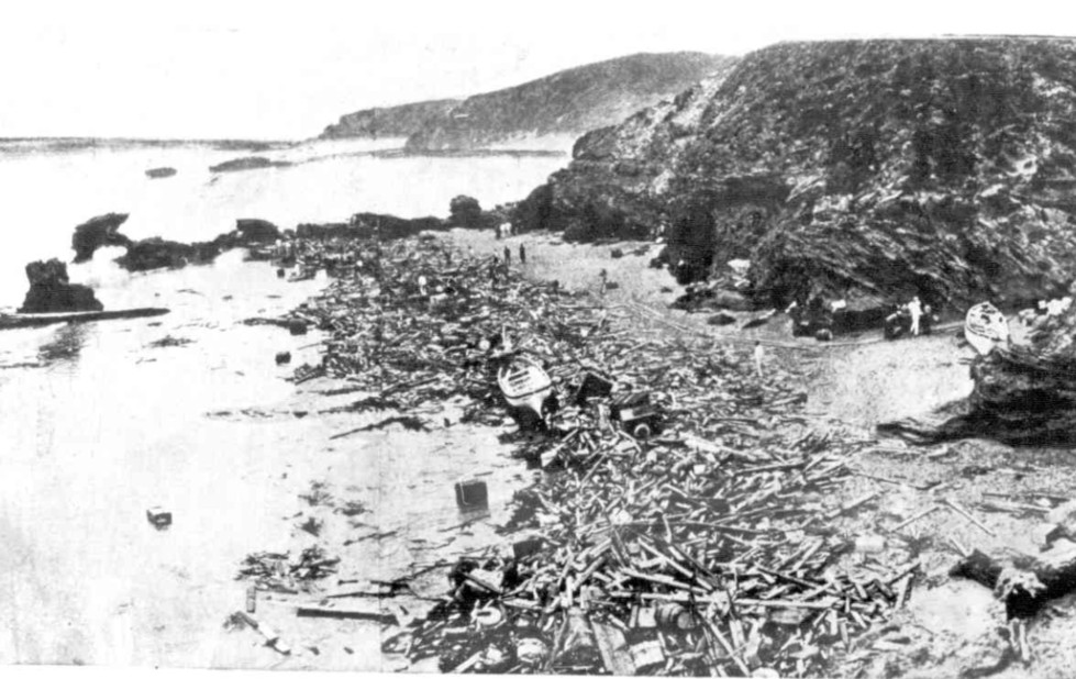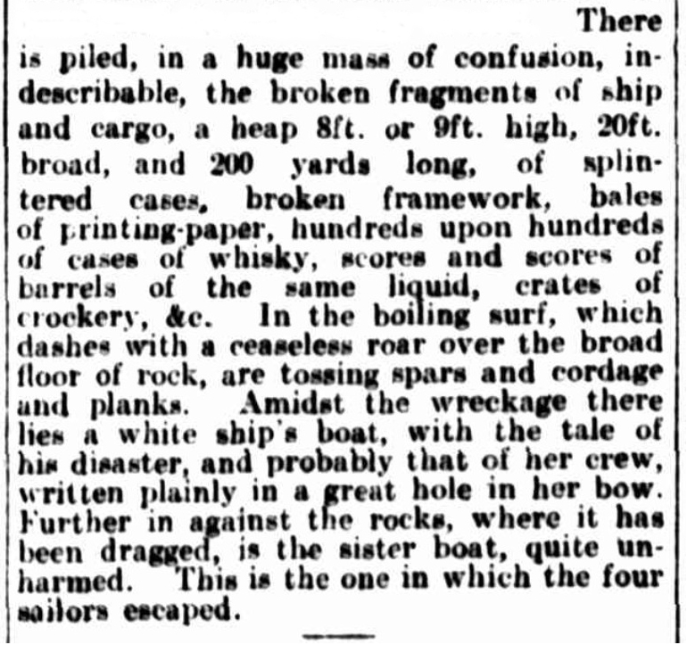 The vessel’s hull continually pounded the rocks, as huge breakers began to sweep the decks clean, with the crew battling for their lives and trying to gain shelter wherever it could be found. The captain ordered the lifeboats to be launched immediately to save life, the port lifeboat being the first lowered with 14 crew scrambling into it, only to be immediately overwhelmed by heavy breakers, until only four seamen remained in the swamped lifeboat when it was finally cut away. By some miracle this waterlogged boat managed to evade all hazards and washed through a gap in the reef, where it washed ashore on a sandy beach. One other seaman named Griffiths, who had been washed out of this lifeboat managed to swim ashore and was found bruised and battered on the rocks nearby.