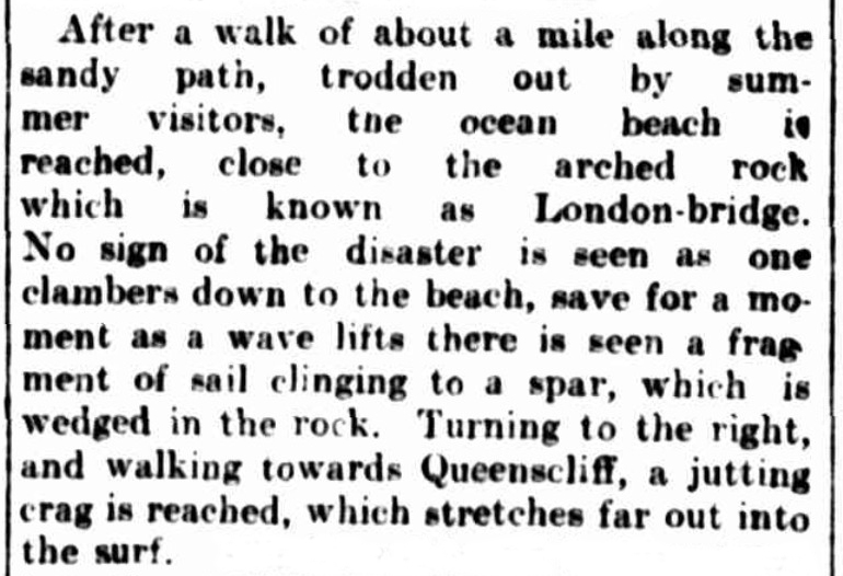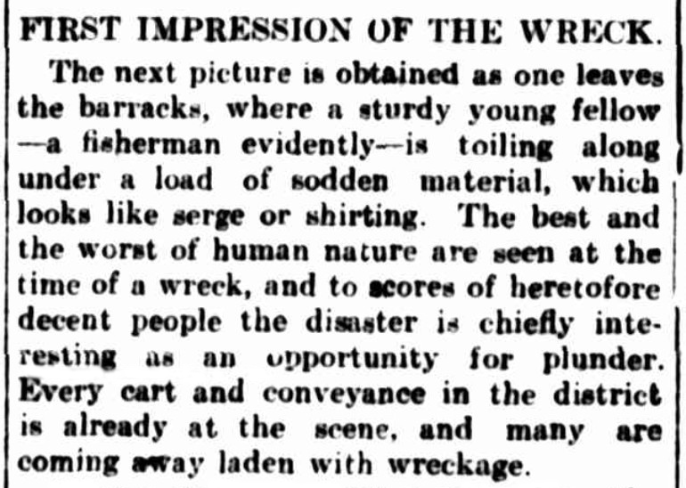 A second lifeboat which followed, was immediately smashed to pieces beneath the feet of the crew who were attempting to launch it from the doomed Sierra Nevada, unfortunately none of the crew in the second boat survived. Delahunty one of the five survivors who reached shore volunteered to go for help and walked to Portsea to raise the alarm. Help soon arrived and all five seamen were taken to the Portsea Barracks and the Quarantine Station to be cared for by the army. Help of a different kind also arrived, in the form of locals wishing to plunder and remove anything of value from the wreckage, constantly being piled up on the beach abreast of the wrecksite.