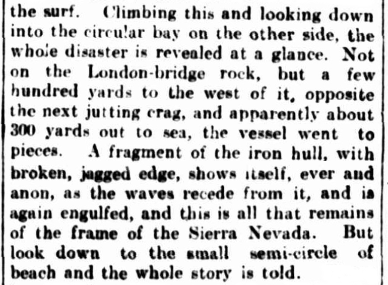 After a routine voyage of 113 days, the Sierra Nevada arrived off Port Phillip Heads at 6 p.m. on the 8 May, and during the night the wind veered around to the south and freshened. A good description of what happened next was published in the Argus 10 May 1900: