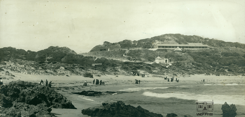 VNEP P1155 Sorrento Back Beach c1890 Published November 16, 2014 at 800 × 382 in Localities Sorrento Back Beach c.1890 VNEP P1155 Description: Sorrento Back Beach c.1890 Donated: Notes: Note the tram station up the hill. Return to LOCALITIES