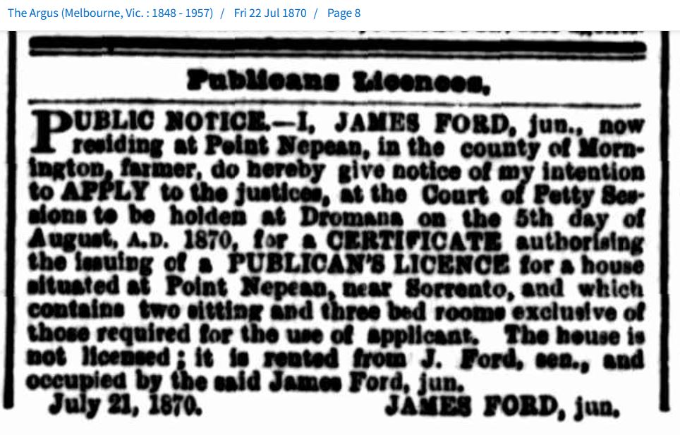 At this time the hotel was in a very small building. The original owner was James Sandle Ford. In 1872 he then employed John Farnsworth, (who had previously built the Sorrento Hotel), to build the very large Nepean Hotel well known for many years. The building was much more expensive than Ford had anticipated, and he was forced to borrow a large amount of money. Shortly afterwards, Farnsworth became manager of the hotel.1